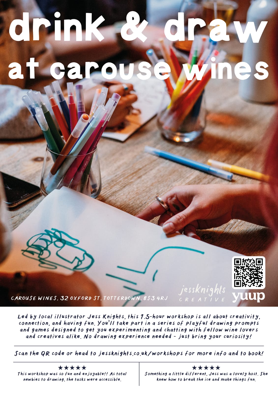About: Led by Bristol illustrator Jess Knights, this 1.5 hour workshop is all about creativity, connection and having fun. You’ll take part in a series of playful drawing prompts and games designed to get your creative juices flowing and chatting with fellow wine and art lovers.